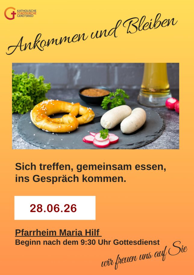 Ankommen und bleiben – Frühschoppen mit Weißwurst oder Kaffee und Kuchen + iCal / Outlook export AktuellesVeranstaltungen und Gottesdienste Regelmäßige Gottesdienste Gottesdienstanzeiger Pfarrbrief “WIR Gemeinsam”