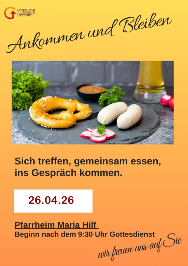 Ankommen und bleiben – Frühschoppen mit Weißwurst oder Kaffee und Kuchen + iCal / Outlook export AktuellesVeranstaltungen und Gottesdienste Regelmäßige Gottesdienste Gottesdienstanzeiger Pfarrbrief “WIR Gemeinsam”