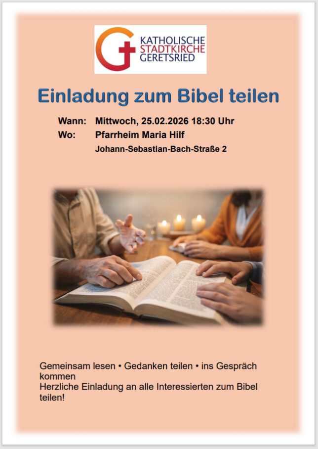 Einladung zum Bibel teilen + iCal / Outlook export AktuellesVeranstaltungen und Gottesdienste Regelmäßige Gottesdienste Gottesdienstanzeiger Pfarrbrief “WIR Gemeinsam”