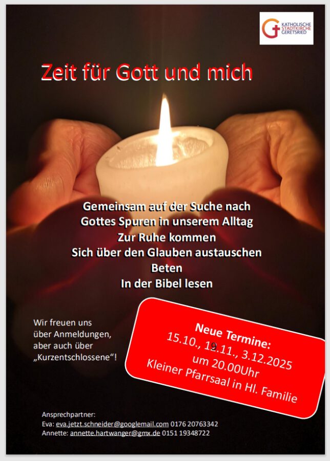 Zeit für Gott und mich + iCal / Outlook export AktuellesVeranstaltungen und Gottesdienste Regelmäßige Gottesdienste Gottesdienstanzeiger Pfarrbrief “WIR Gemeinsam”